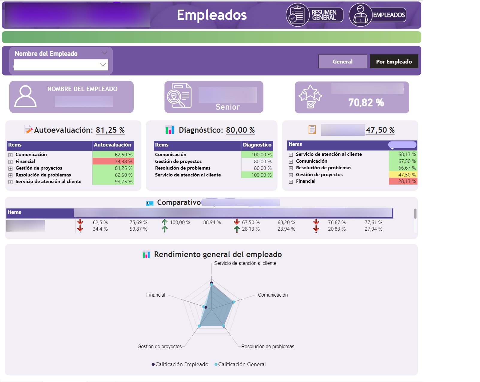 Utilizamos PowerBI para diseñar un reporte elegante que representara los datos de manera visual y comprensible. Las visualizaciones seleccionadas permitieron comparar y contrastar las respuestas de las diferentes evaluaciones, poniendo de manifiesto áreas de fortaleza, oportunidades de mejora y patrones emergentes. Este análisis profundo ha sido instrumental para el área, proporcionando una base sólida para la toma de decisiones y la implementación de estrategias de desarrollo personal y profesional