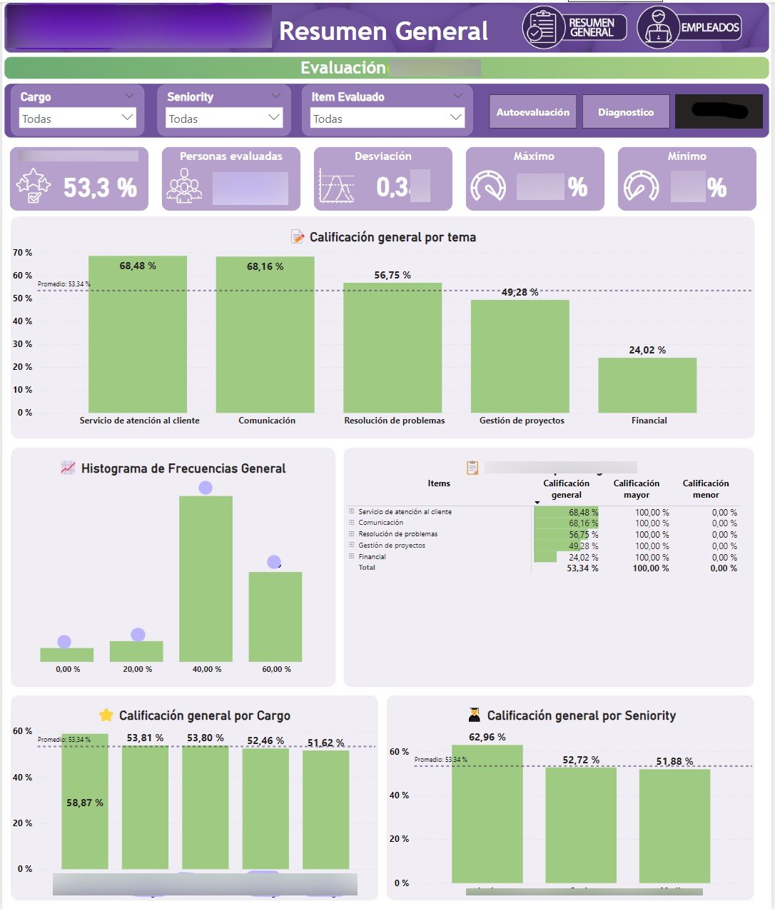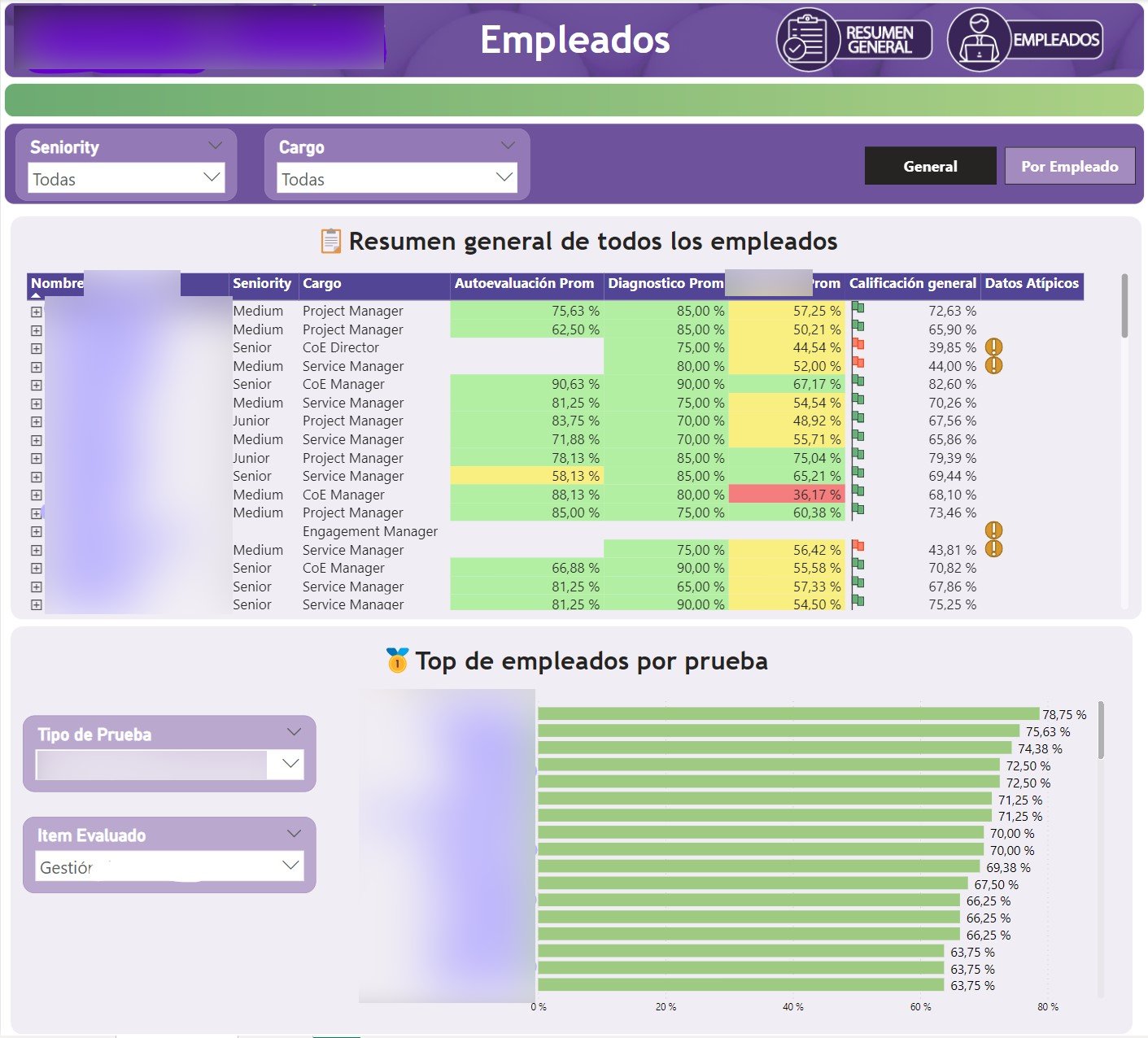 Enfrentamos el reto de consolidar y analizar diversas evaluaciones, desarrollando un reporte sofisticado en PowerBI que combina autoevaluaciones, evaluaciones de jefes directos y evaluaciones en línea. Este enfoque multifacético proporcionó una visión integral del desempeño del equipo, revelando insights clave para impulsar el crecimiento y la mejora continua